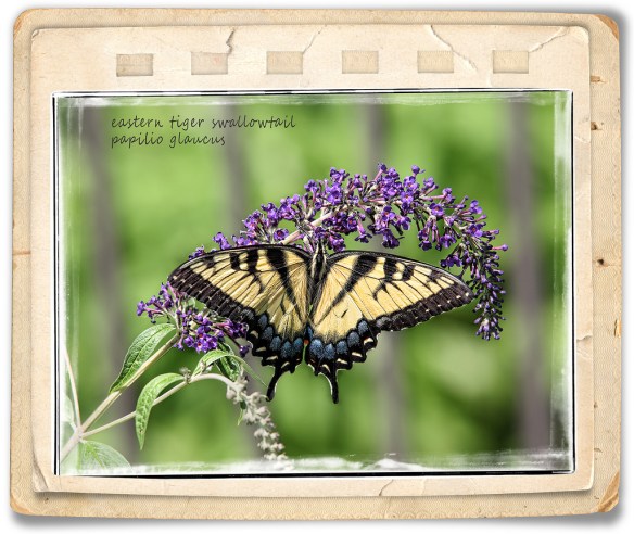 On Sunday, Doug and I went to the University of Michigan Botanical Gardens hoping to get some butterfly photos. As you can see from the picture above, the gardens were in full bloom, but we were disappointed to find only bees buzzing around the flowers. We took a few photos, whining a good deal of the time about the lack of the lovely winged insects, and then we set out for home. As we were driving down the freeway there was a sudden loud “plunk” as a large insect hit the windshield. When I turned and looked over at Doug he simply said, “Yes…it was a butterfly.” The irony continued at home when while sitting out on the deck the swallowtail pictured below fluttered and flapped and feasted leisurely on the flowers growing in our own backyard pots. As I looked at the photo of Doug on my computer the next day, surrounded as he was by masses of beautiful flowers, I realized how foolish we were that afternoon not to be grateful for the present moment just as it was, even if it did happen to be butterfly free. So I guess our lesson for the day was – You don’t necessarily need to wander far from home to find your heart’s desire, but if you do, for heaven’s sake – stop and smell the flowers along the way!